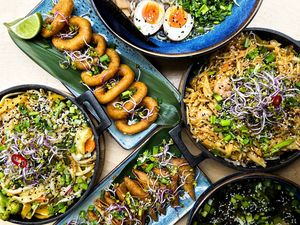 Ostra tajska zupa: wywar rybno wołowy, pasta tom-yum, pasta curry, mleczko kokosowe, kiełki fasoli mung, grzyby słomiane, kolendra, pomidorki koktajlowe, cebula, krewetki lub tofu.