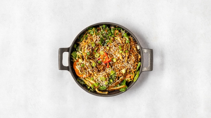 Makaron ryżowy, szpinak, kapusta biała, marchew, imbir, czosnek, cebula, szczypiorek, sezam, sos łagodny sojowy.
