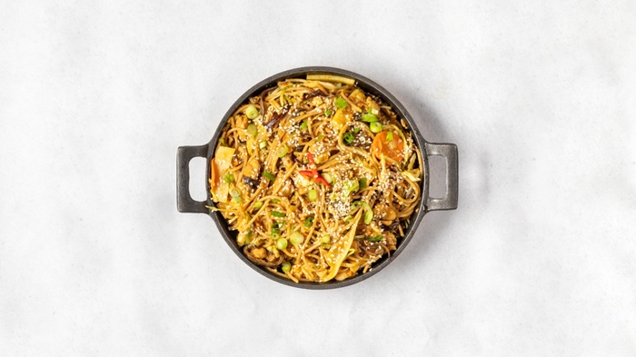 Makaron pełnoziarnisty, kurczakiem, grzybami moon, pędami bambusa, orzeszkami ziemnymi, kapustą białą, marchewką, imbirem, czosnkiem cebulą, szczypiorkiem, sezamem i sosem curry kokos + teriyaki.
